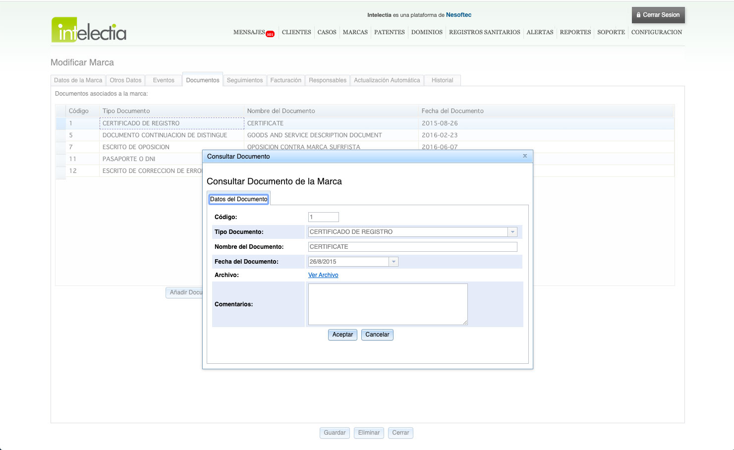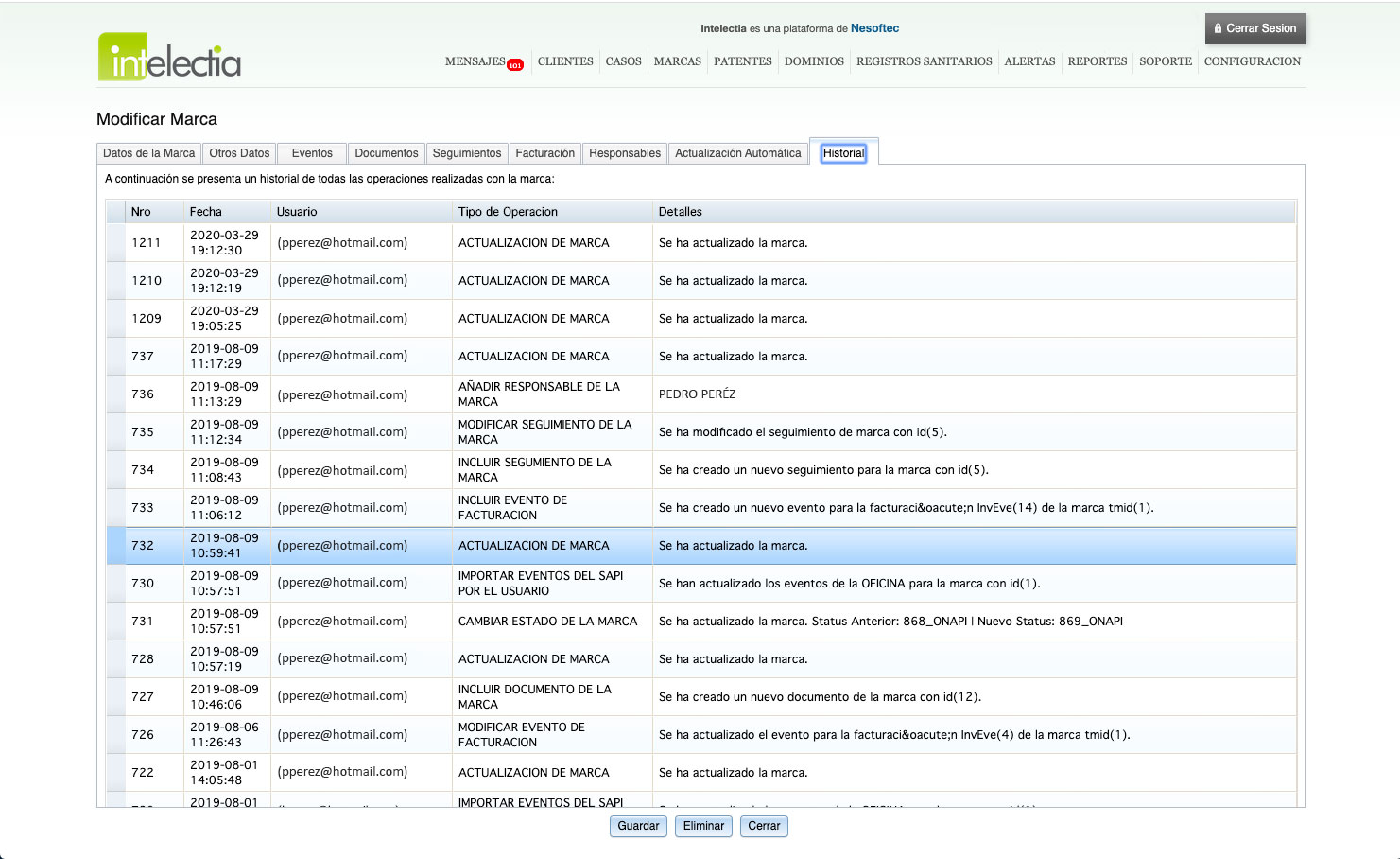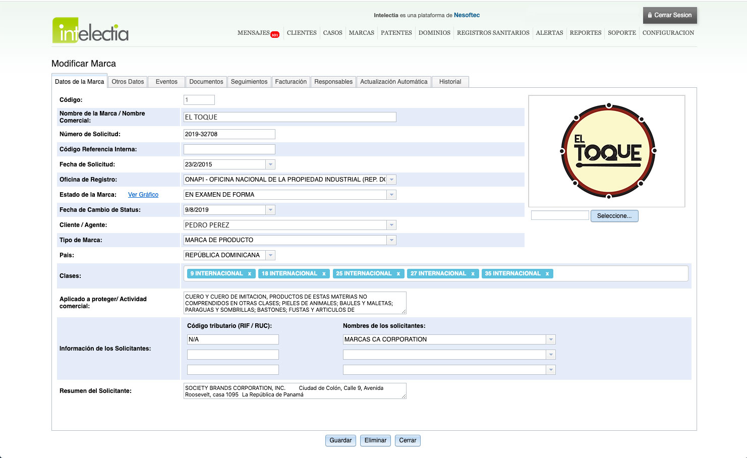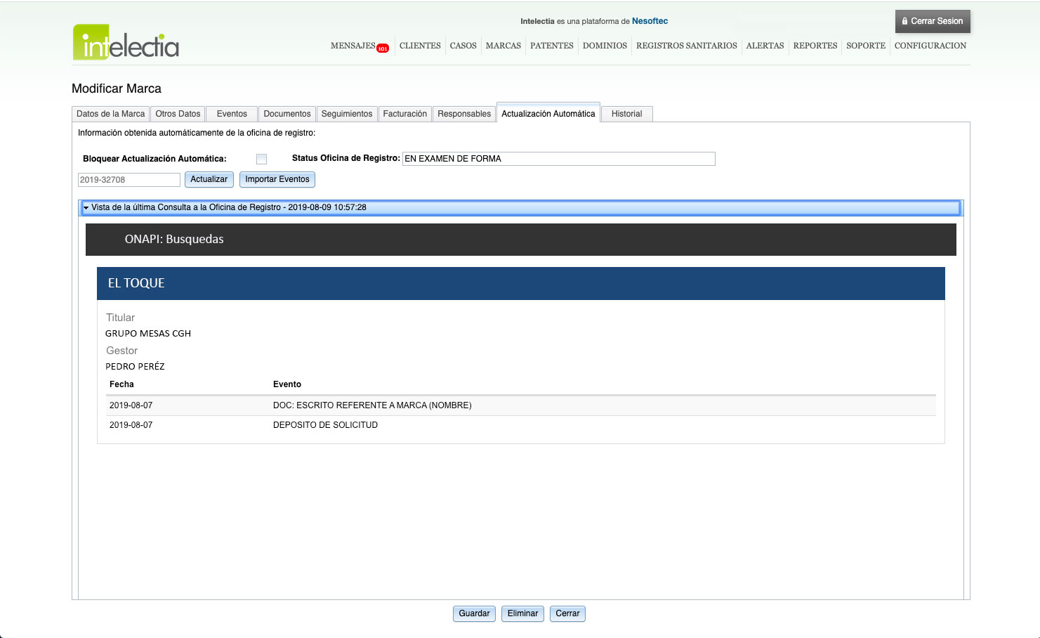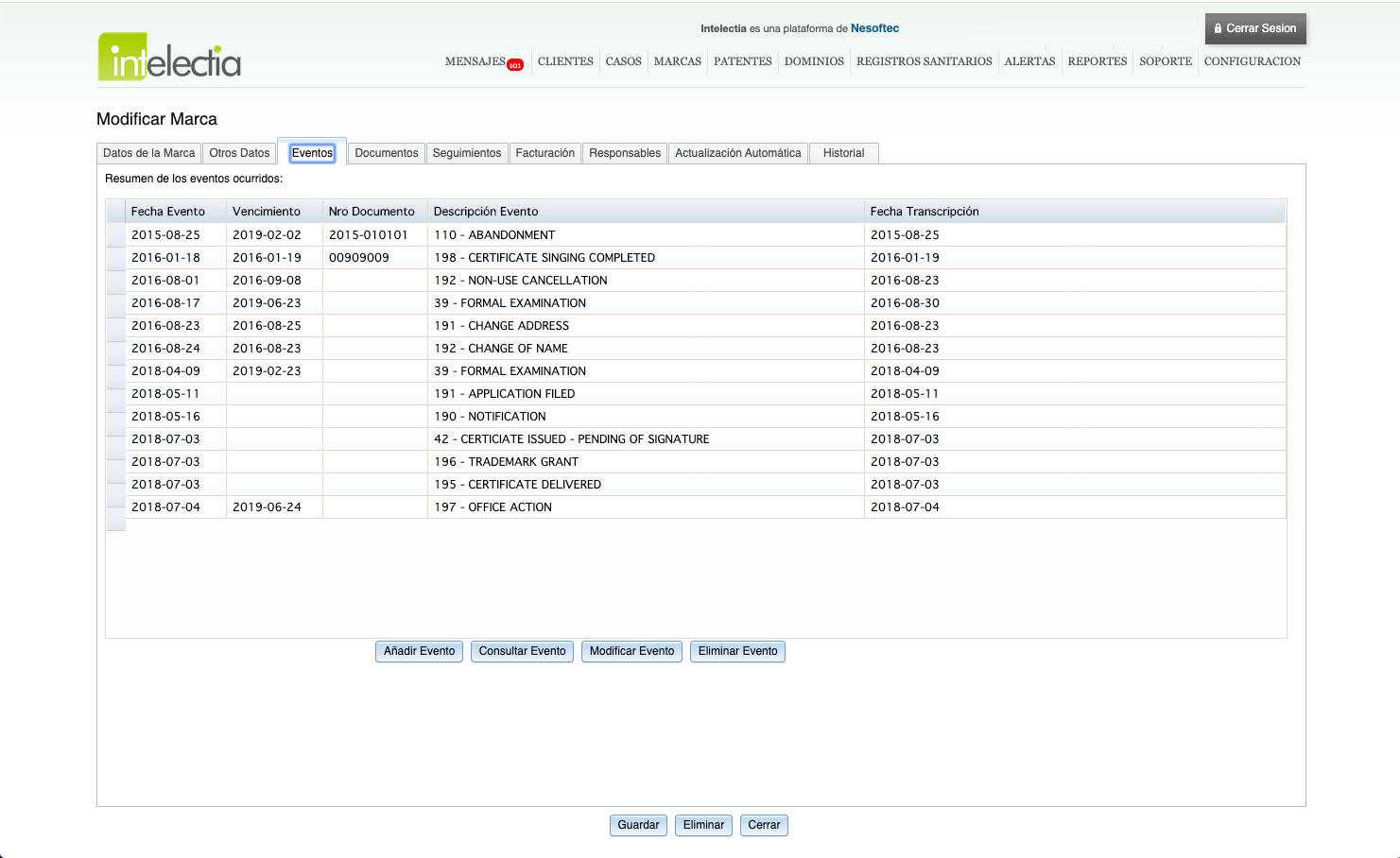 Nuestra interfaz cuenta con todos los aspectos del registro y seguimiento relevantes: datos de la marca, documentos, eventos, seguimientos hechos al cliente, eventos de facturación, información en tiempo real de la oficina de registro, historial de cambios, documentos electrónicos, entre otros.